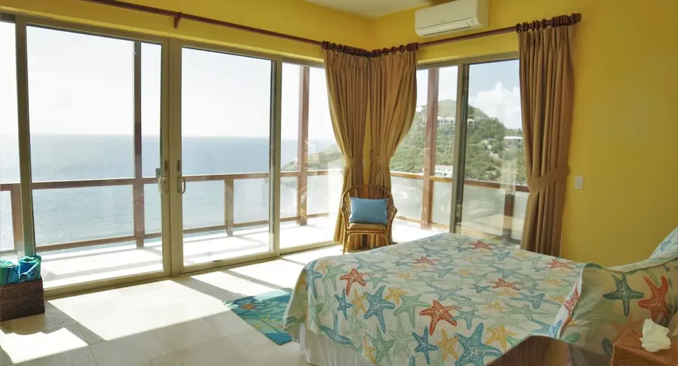Slide open floor-to-ceiling glass, step out onto the wrap-around hardwood deck, and let that 180° ocean scene wash over you. Every bedroom opens to private decks, so whether you rise with the sun or unwind with the stars, you’ve got your own “front-row seat.” Down below is more magic: a coral-stone patio, tall bougainvillea, day-beds around the pool, and built-in spa bubbles calling your name. If you’re up for a bit of adventure, descend the ~220 stone steps to Hart Bay’s rocky shoreline for snorkeling, beach-combing, or sunrise coffee by the water.